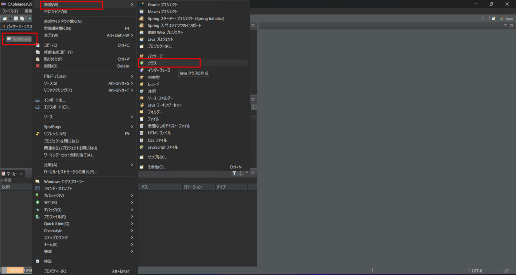 次にJavaのコードを記載するクラスを作成するために作成したプロジェクトを右クリックし、