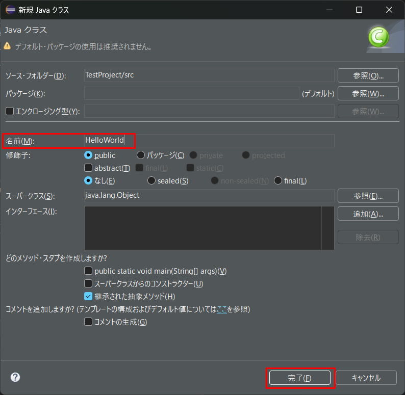 表示された「新規 Java クラス」の画面の名前に「HelloWorld」と入力し、完了ボタンを押下します。