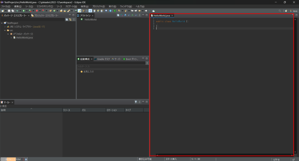 完了するとeclipseの右側に作成したHelloWorldクラスが表示されます。
