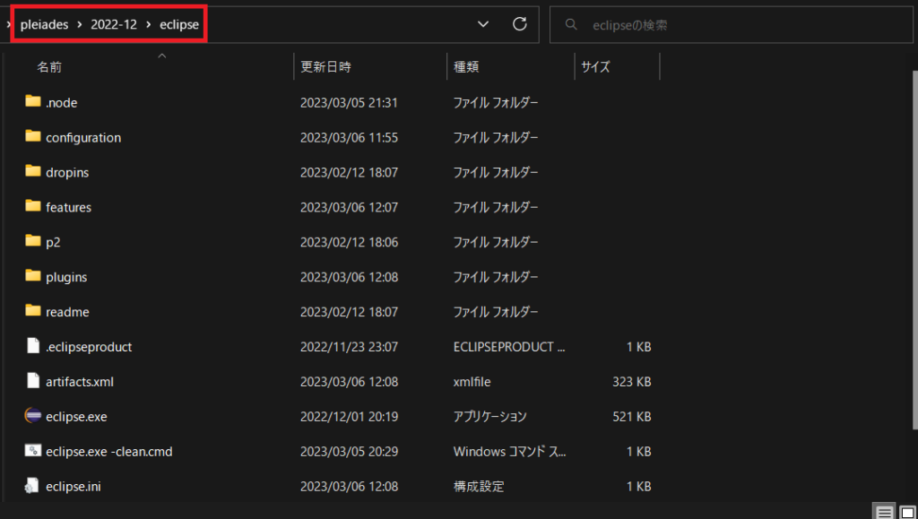 解凍すると以下のようなフォルダ構成となっているはずなので、赤枠で囲ったパスまで移動し、eclipse.exeをダブルクリックしてください。