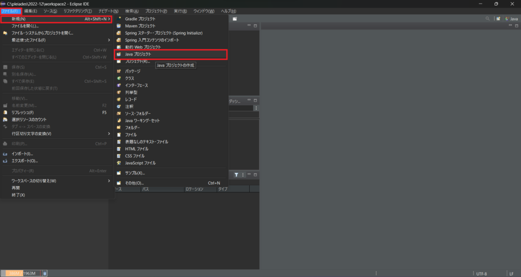 次にeclipse上で[ファイル]ー[新規]ー[Javaプロジェクト]を押下し、Javaプロジェクトを作成します。