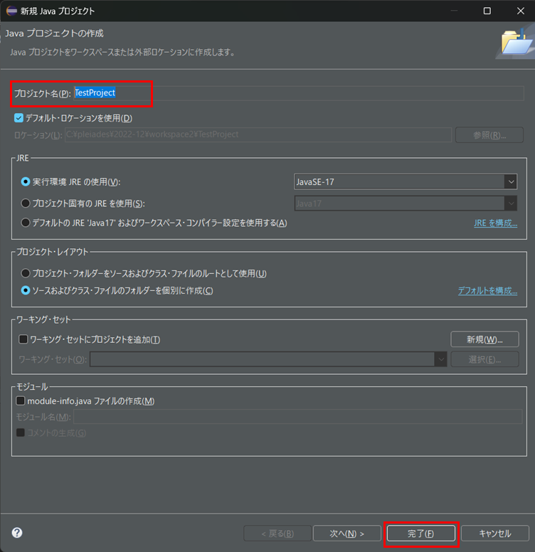 表示された「新規 Java プロジェクト」の画面のプロジェクト名に「TestProject」(仮名)を入力し、完了ボタンを押下します。