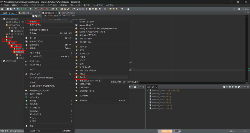 プロジェクトの[src]-[main]-[webapp]-[WEB-INF]と辿って右クリックし、[新規」-[ファイル]を押下します。
