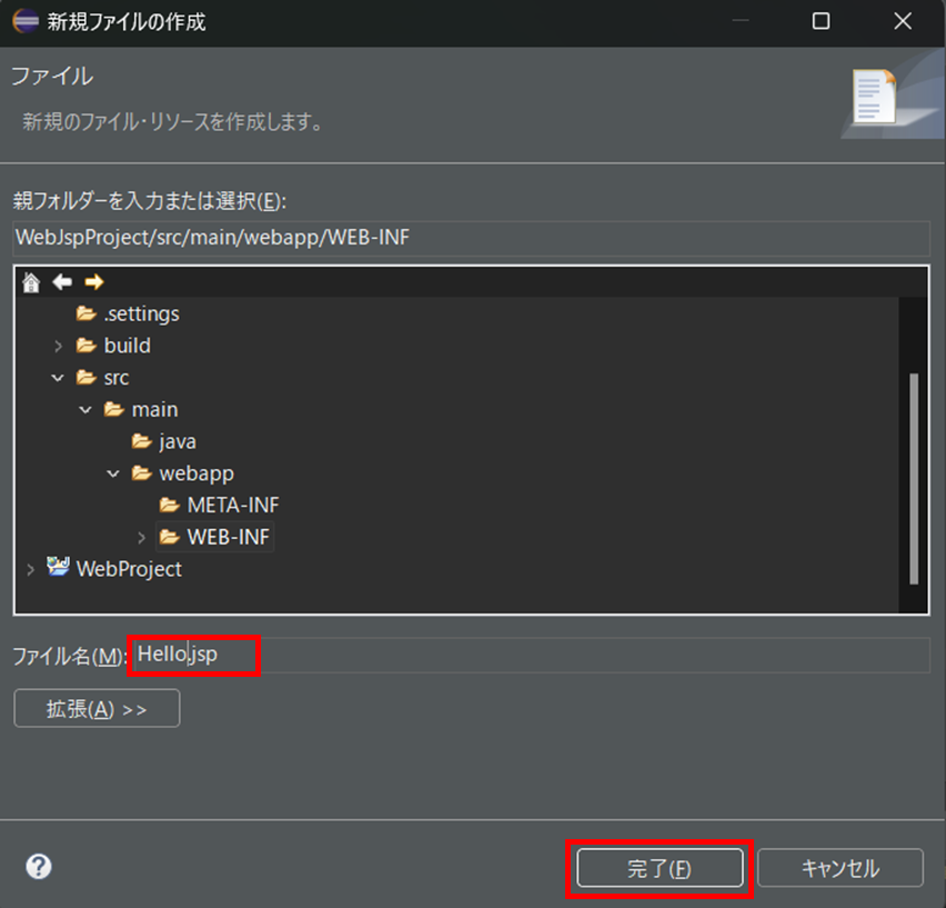 新規ファイル作成の画面が表示されたらファイル名に先ほど表示させる記述をした「Hello.jsp」と入力し、完了を押下してください。