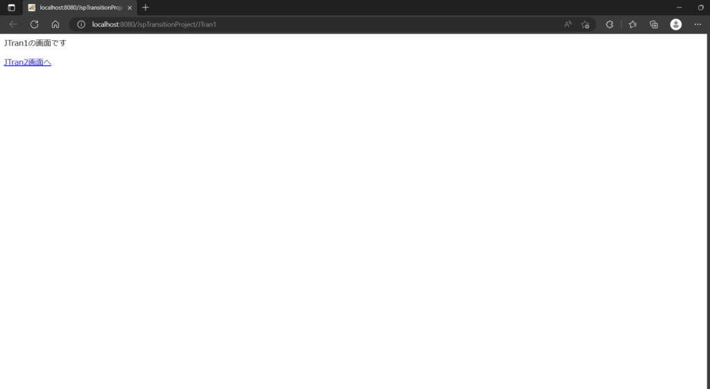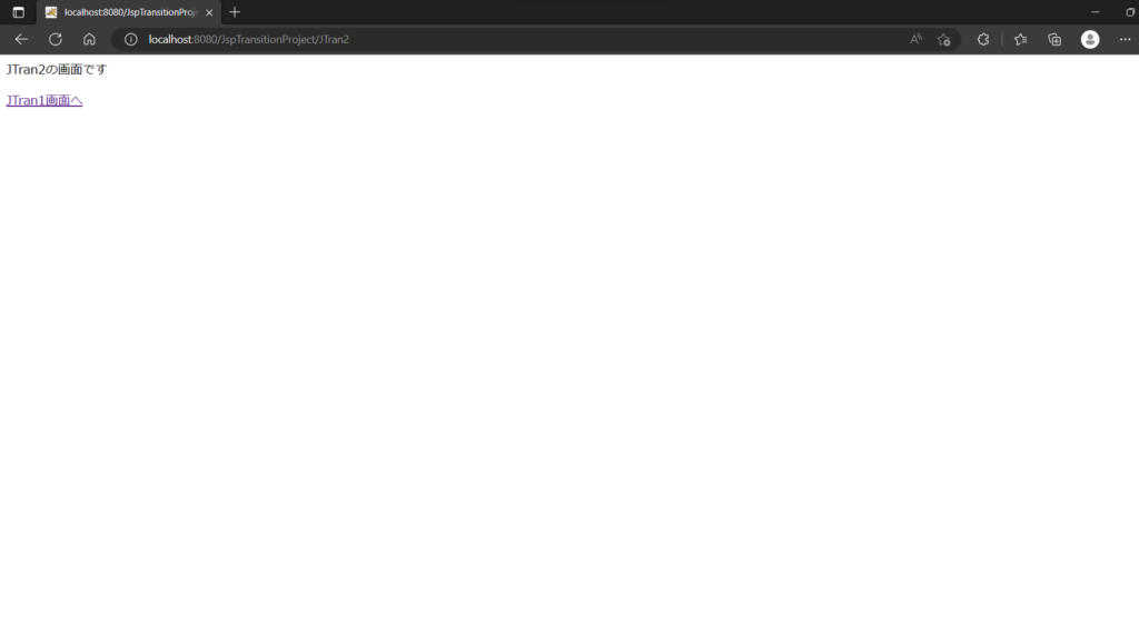 分かりにくいですが、無事画面表示が変わり、”JTran2の画面です”と表示され、URLを見てもJTran2に変わっています。これでJSP間の画面遷移が成功したこととなります。