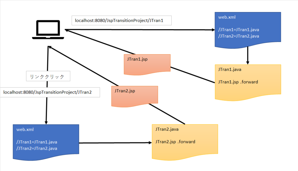 リクエストが飛ぶと、web.xmlでそのurlの場合どのjavaクラスを呼びに行くか確認し、次に対象のJavaファイル「JTran1.java」を呼びに行きます。その後、Javaの処理で「JTran1.jsp」を表示するという処理が記載されているため、ブラウザにJTran1.jspを返しての画面が表示されるという仕組みです。