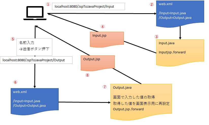 ②web.xmlを見て、URL(/Input)からInput.javaを呼び出す